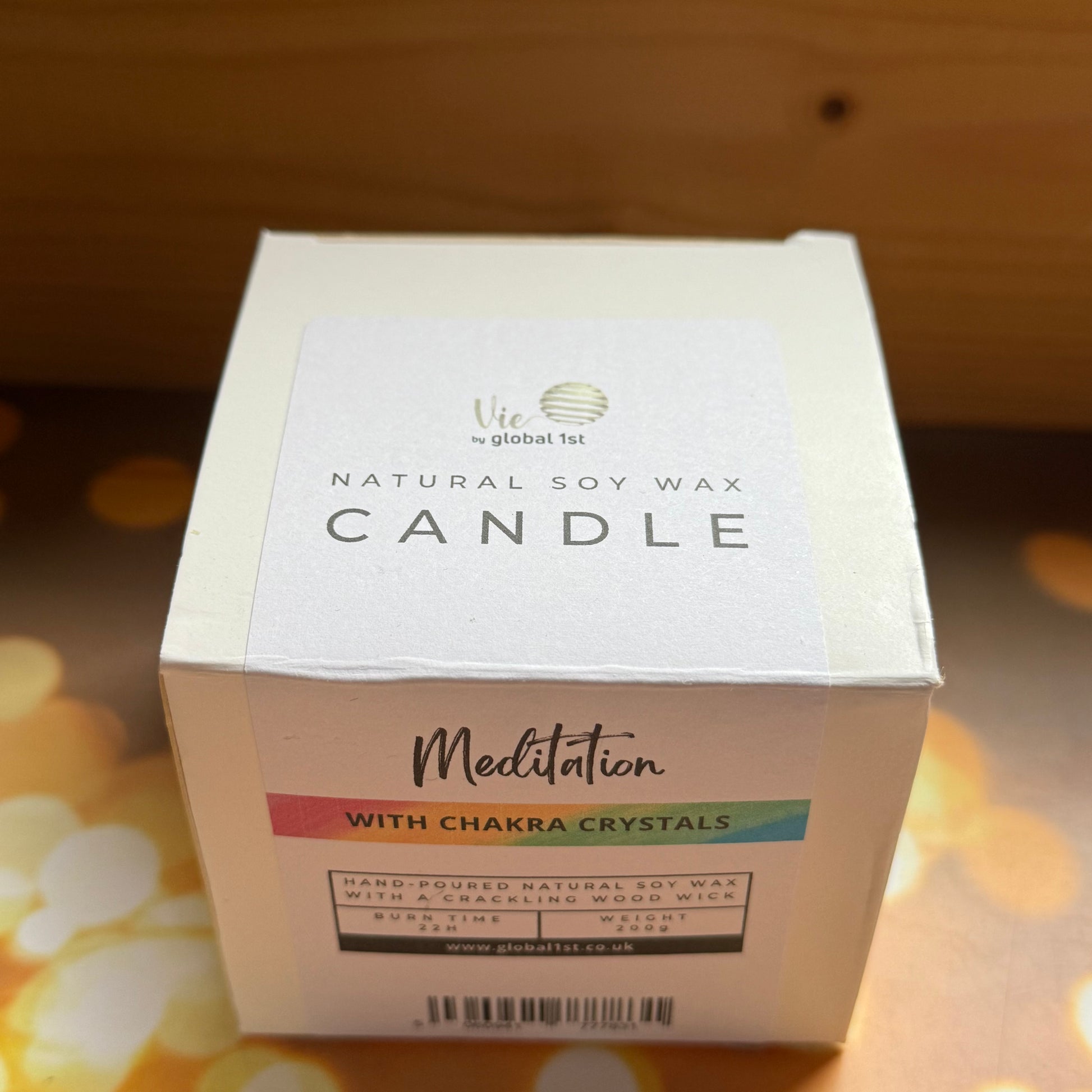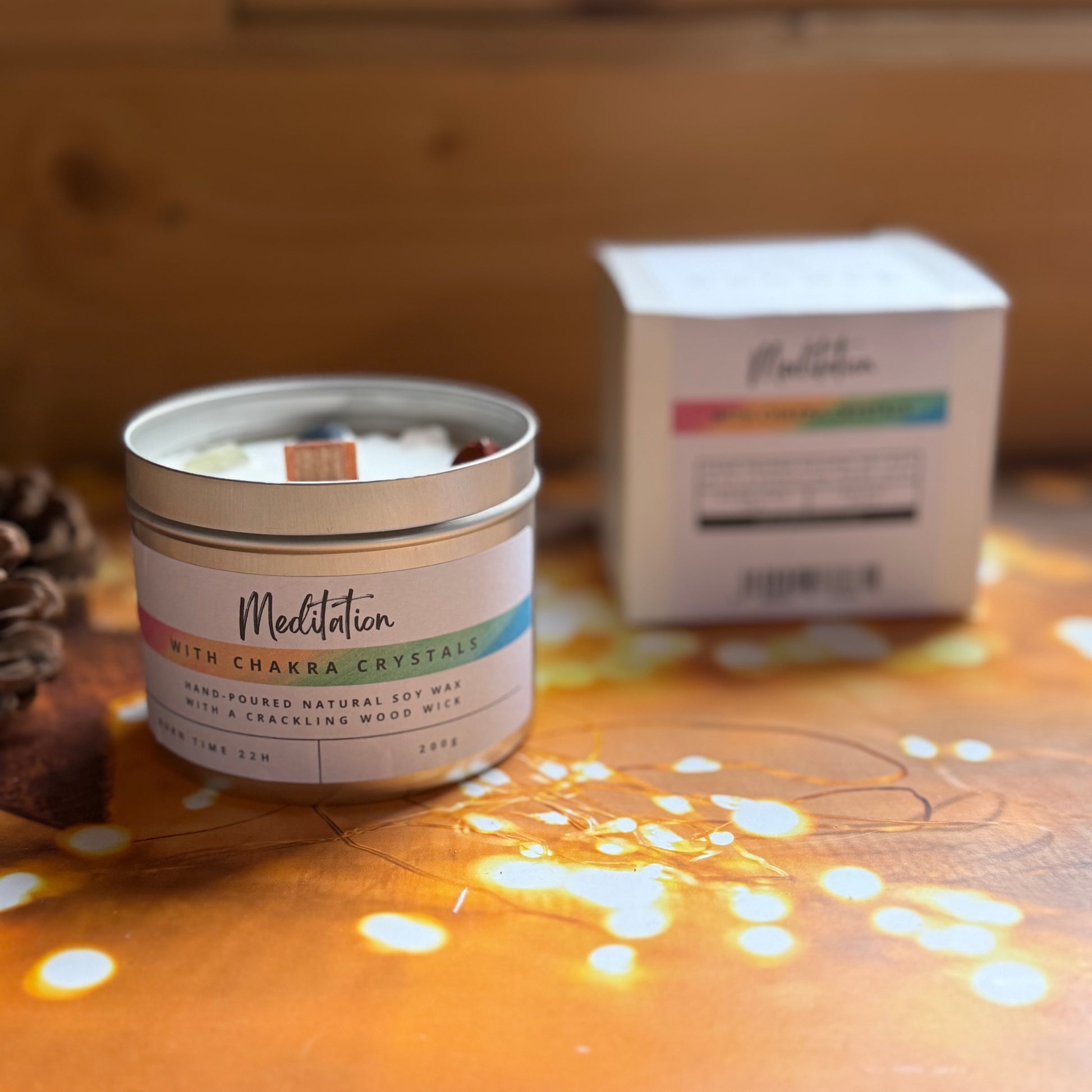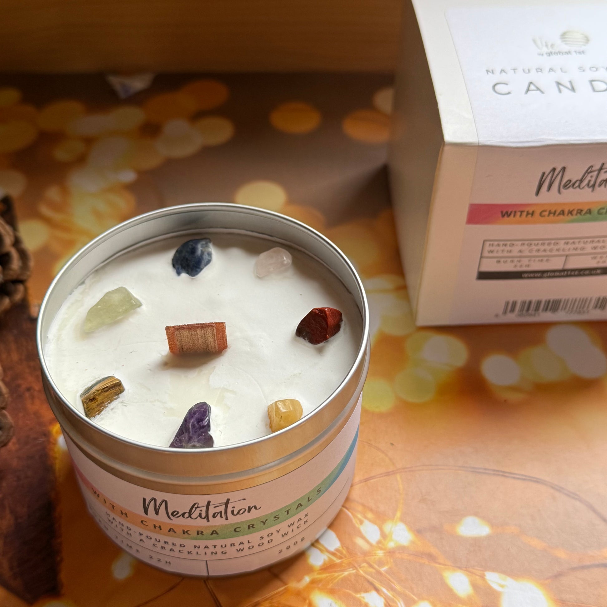 Meditation Scented Candle with 7 Chakra Crystals, Hand-poured Natural Soy Wax with a Crackling Wood Wick