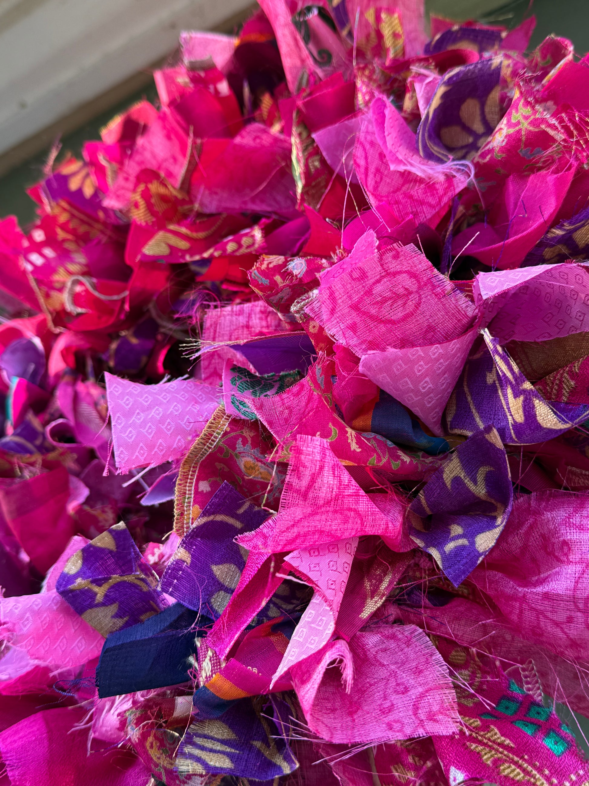 A beautiful rag wreath made from sari offcuts. Guaranteed to add colour to any festive occasion! The wreaths all use upcycled sari pieces left over from my silk sari gift wraps.