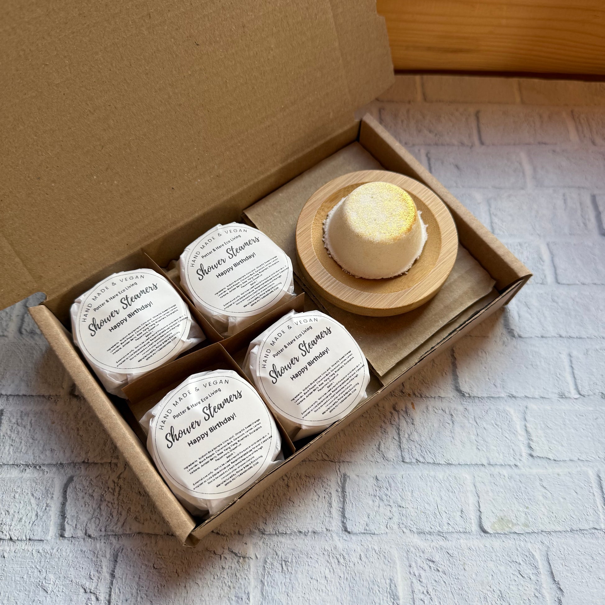 Happy Birthday Special Blend of Aromatherapy Shower Steamers, 4 Steamers Wrapped and presented in a gift box with bamboo Tray