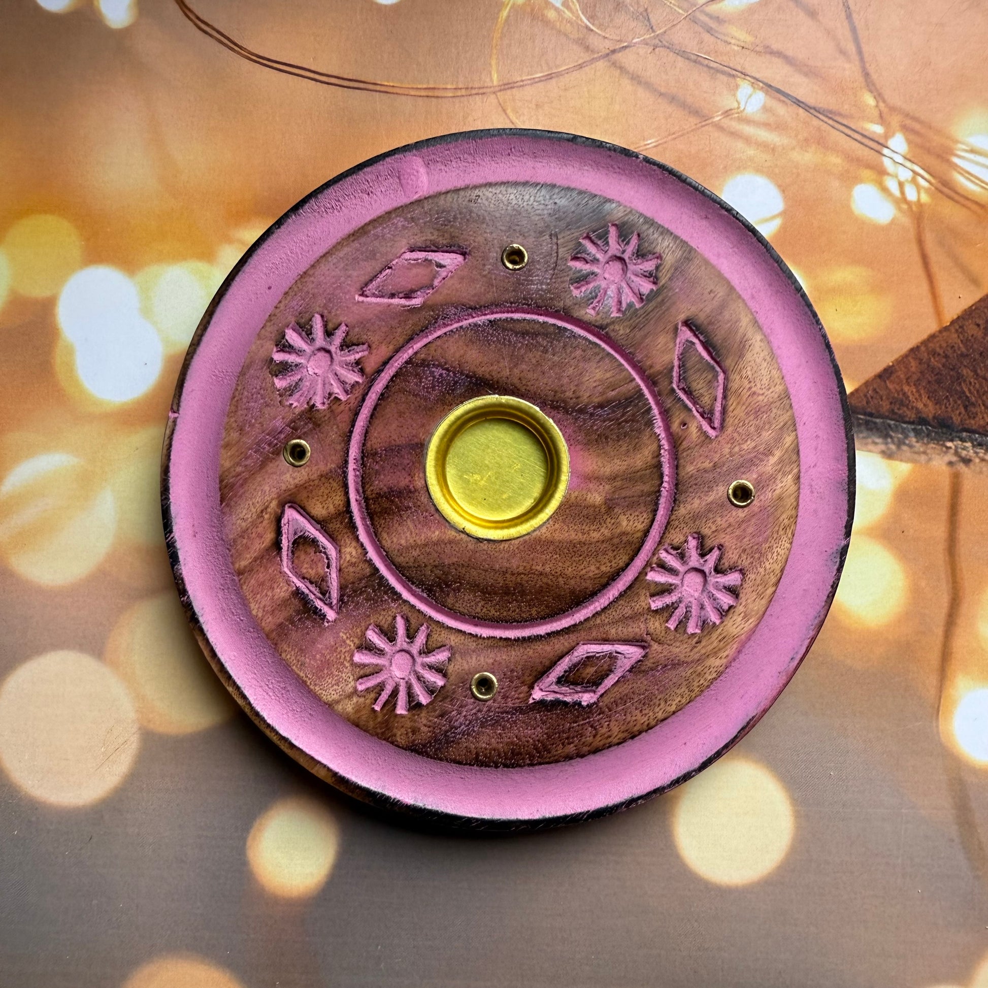 This incense holder is perfect for catching your incense ash but also adding a pop of colour to your home, hand painted in a pretty pink colour with different gold designs on top. You can add up to four different incense sticks at one time.